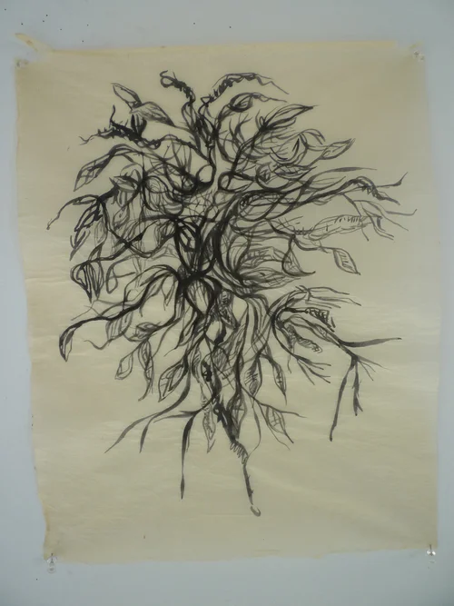 Ink and Ink wash drawing with white acrylic pen on Gampi paper 50”x60”